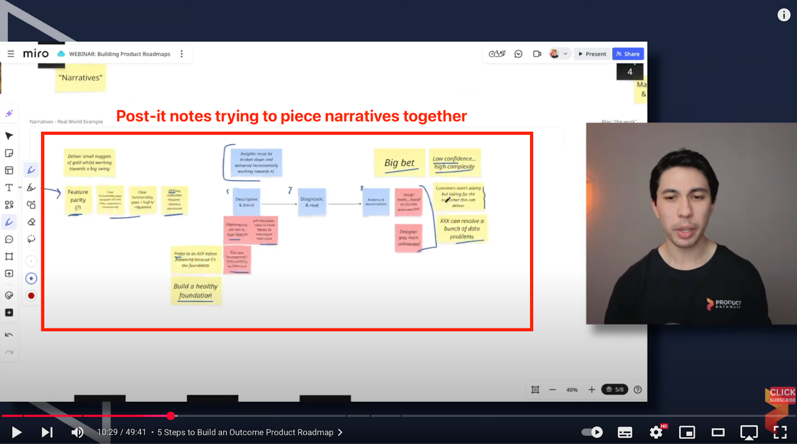 Real example of a Product Manager and I extracting narratives in a miro board