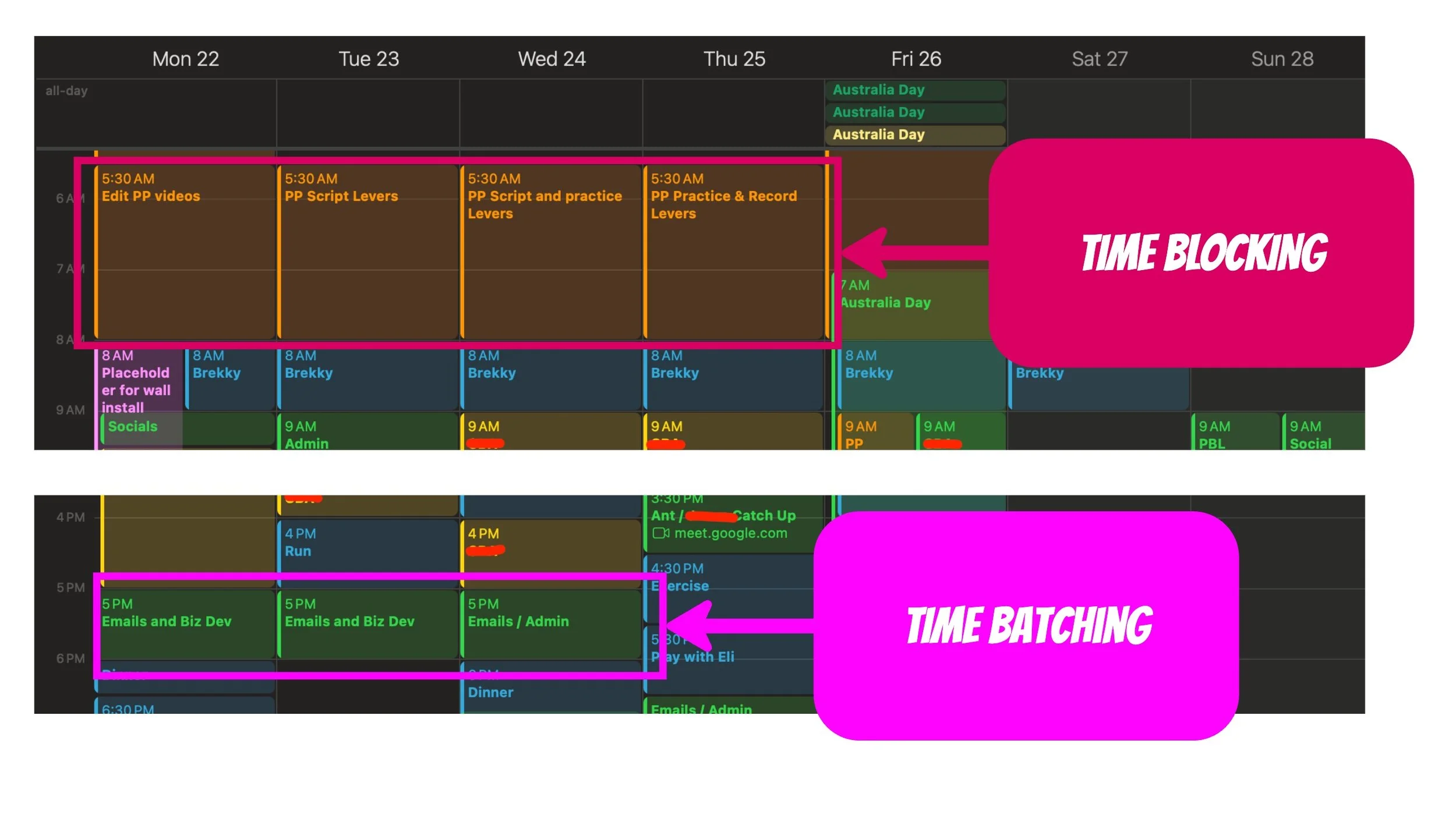 Another example of time batching is how my friend managers his meetings. He batches all his meetings in the morning between 9–12 and then blocks the afternoon out for focused tasks. His team knows this and they work within it.