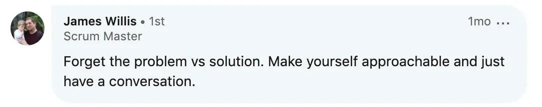 “Forget the problem vs solution. Make yourself approachable and just have a conversation.”